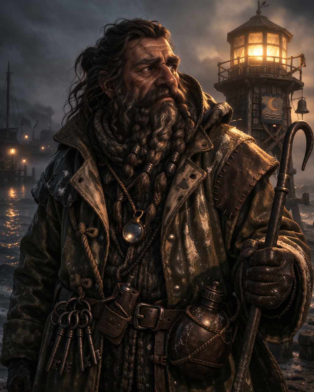 Name: Dorrin Blackwake Role: Lanternkeeper of Moonrest Harbor Ancestry: Dwarf Age: 68 Disposition: Quiet, disciplined, deeply routine-driven.